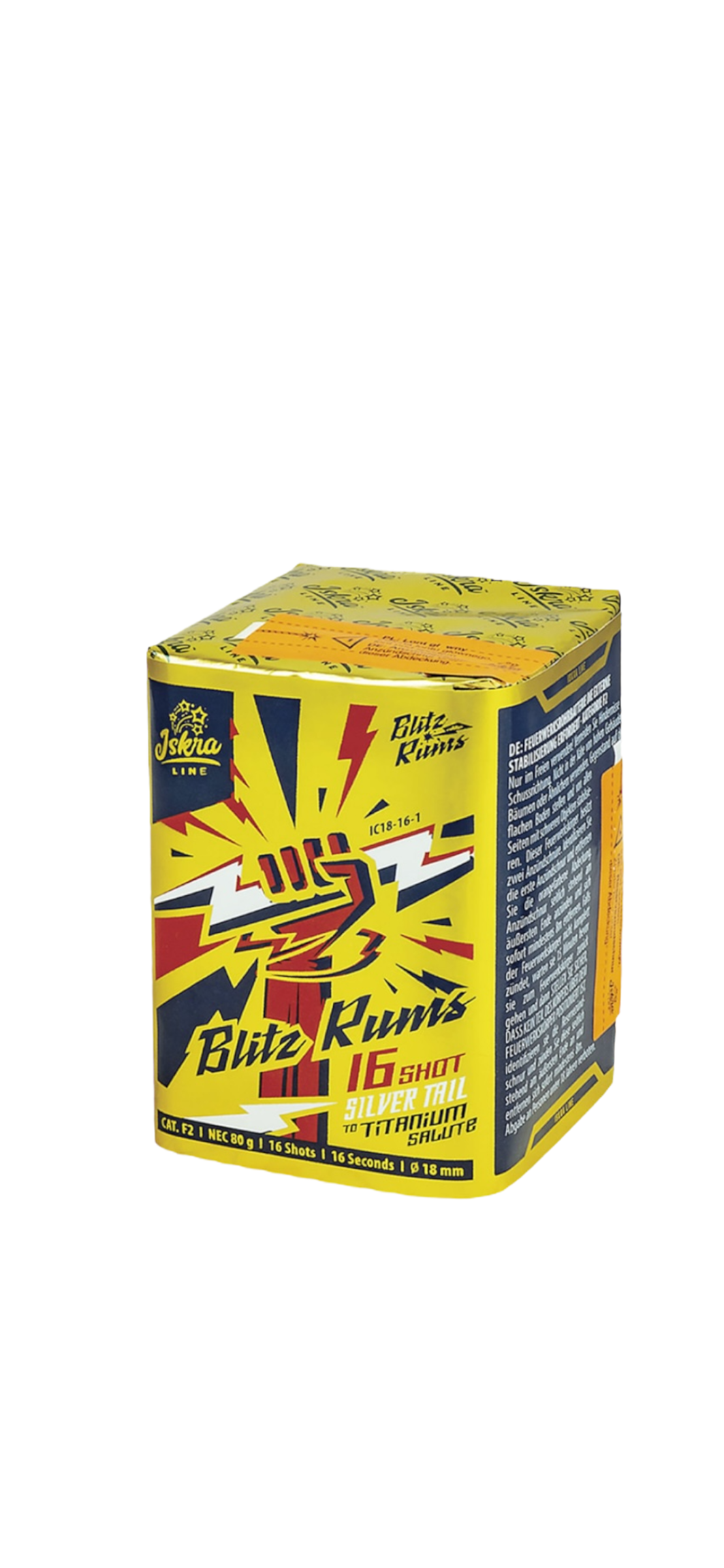 16shots in caliber 18mm with the following effect: Silver Tails to titanium Salute