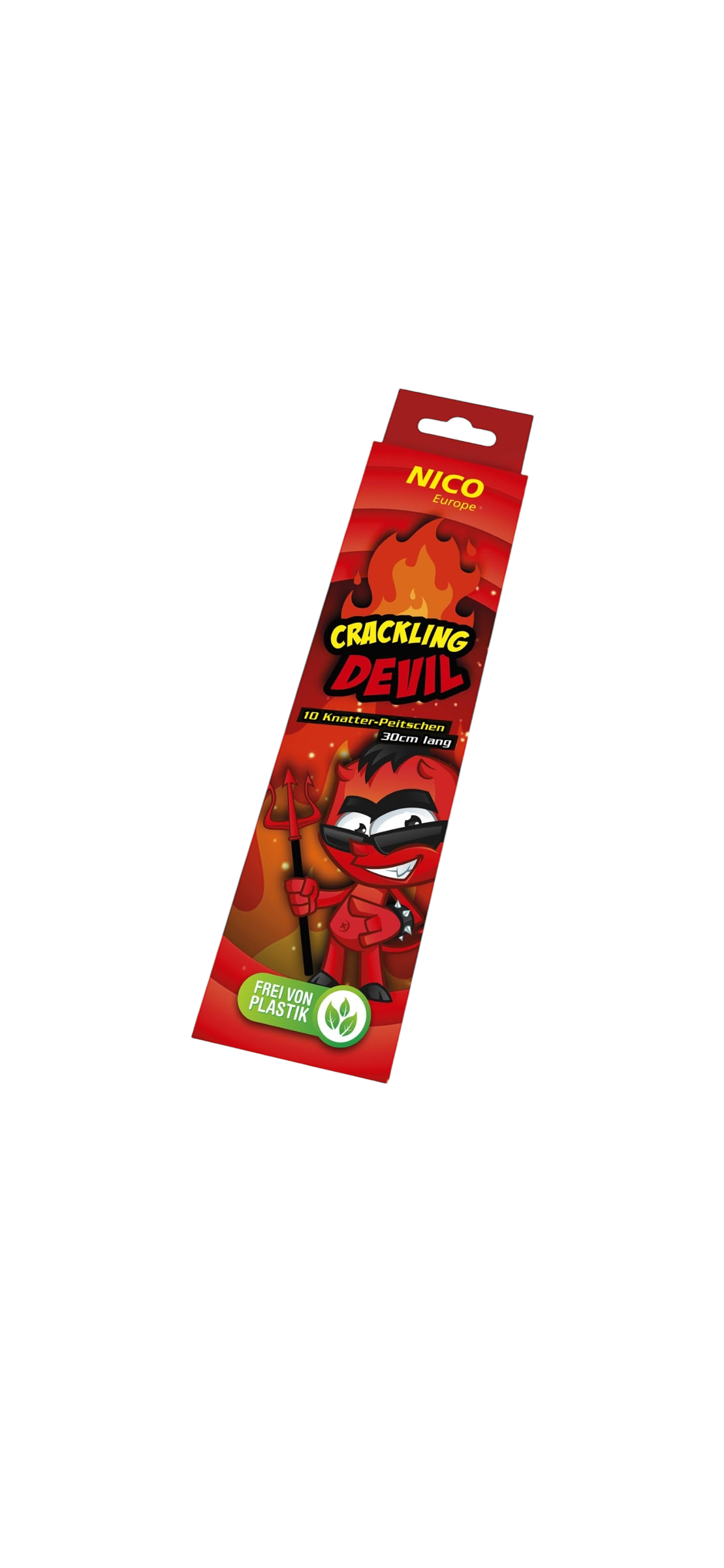 Der CRACKLING DEVIL kommt in einer umweltfreundlichen Pappschachtel mit je zehn 30 cm langen Knatter-Peitschen.