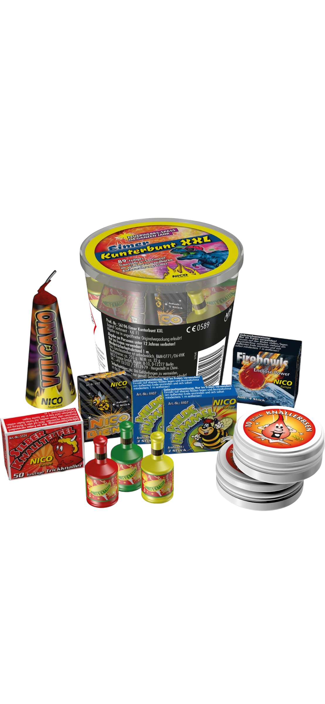 Freuen Sie sich auf jede Menge bunte Farben, putzige Effekte und viel Spaß! Dieser Eimer ist der ultimative Mix aus 89 Teilen. Das Ganzjahres-Feuerwerks-Sortiment im wiederverwendbaren Aufbewahrungseimer bietet die perfekte, bunte Mischung.