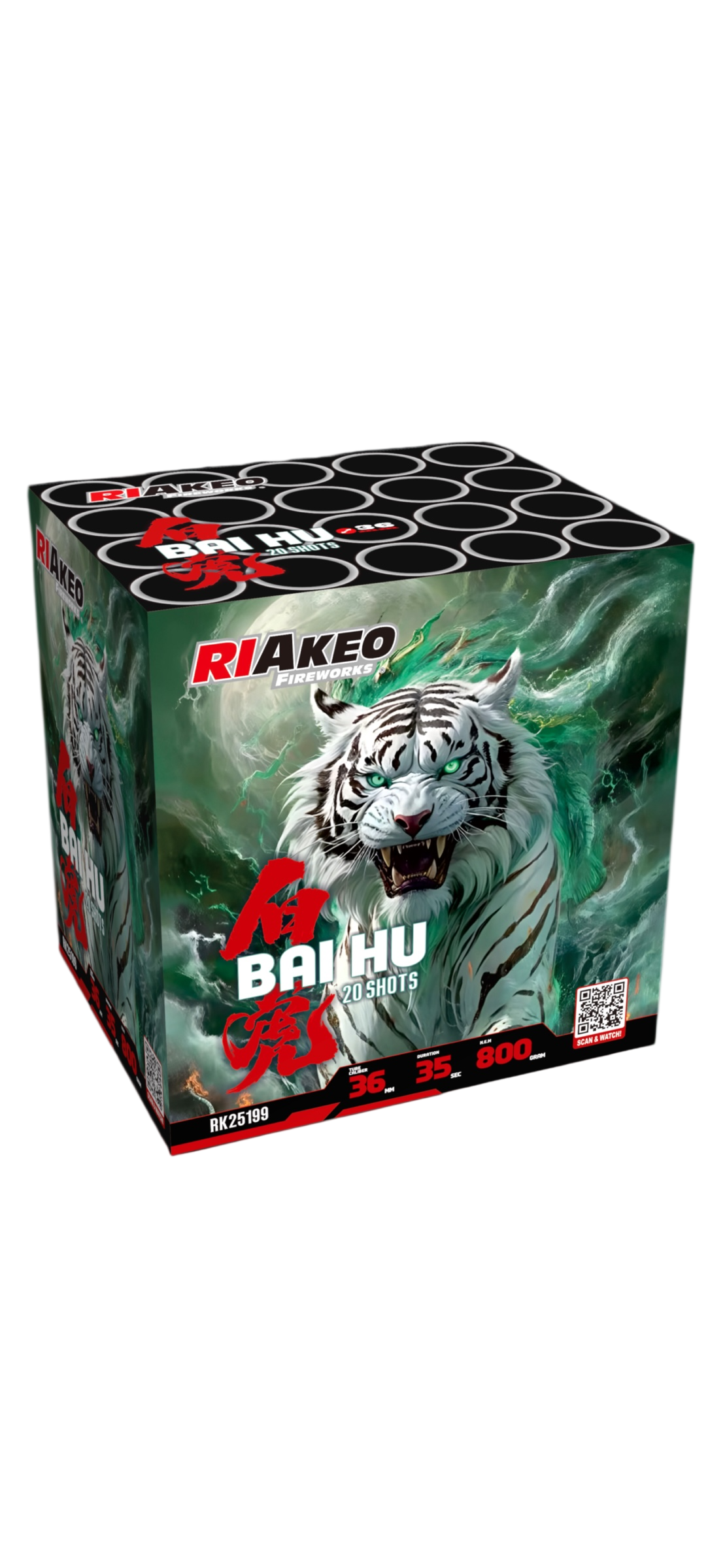Bai Hu von Riakeo Fireworks ist eine 20-Schuss-Batterie im Kaliber 36 mm mit 800 g NEM. Rotblinker-Schweifaufstiege führen zu großen Silberblinker-Buketts, jeweils abwechselnd kombiniert mit verschiedenfarbigen Dahlien.